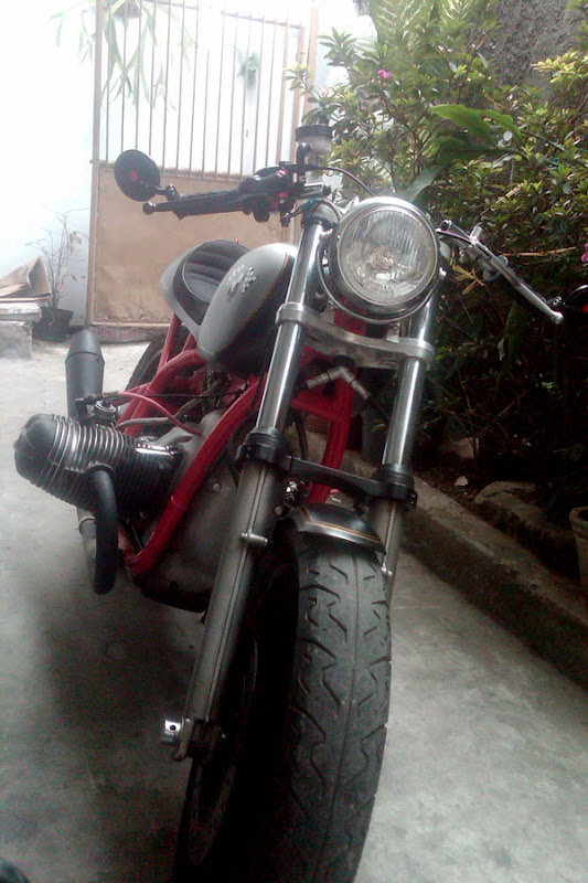Motor sudah bisa berdiri dengan dengan beberapa part custom. Karena kondisi motor seperti ini julukan diberika D’Ladu yang artinya kurang lebih si buluk.